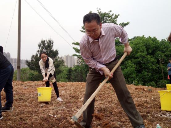 植树现场,学院党总支书记王杰文与老师同学们拿起铁锹、锄头热情地参与到植树活动中。同学们被领导老师的热情所感染,有的挥锹铲土,有的扶树填土,有的培土浇水,忙得不亦乐乎。王杰文书记一边用力地挥动着锄头一边向同学们传授着植树要领:“挖土下去那一下要使劲!土里面的石头要拣出来!”。经过将近一个小时的劳动,100多棵树在山坡上“安家落户”,为一师校园添上了一抹“信工绿”。虽然在植树过程中下起了雨,泥巴裹满了老师、同学们的裤腿,但是永利官网师生仍然坚持完成了植树任务。
