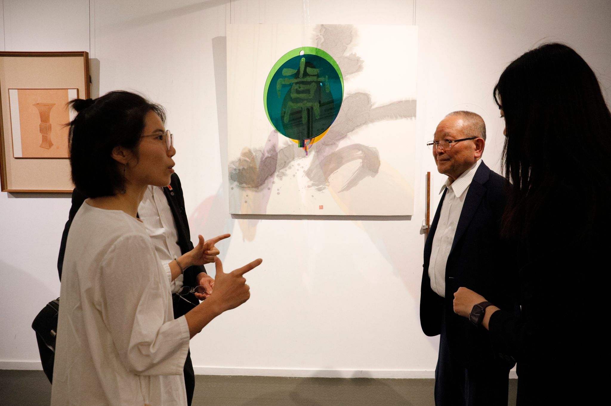 会后,代表团参观了beat365英国官方网站研究生中期作品展。中韩艺术家们对学校在传统艺术创新、跨学科融合等方面的探索给予高度评价。代表团对多件结合书法元素的当代艺术作品进行了热烈讨论,并与天美学子展开深度交流。