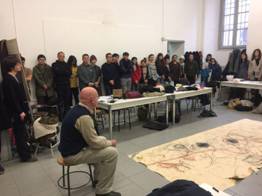 在装饰系,Sergio Nannicola教授向大家介绍了该系的历史沿革,专业特点和发展方向。装饰系最早是为教堂做马赛克装饰,发展到今天,逐渐脱离了宗教的形式和象征,着重研究艺术、空间和附属物的关系。
