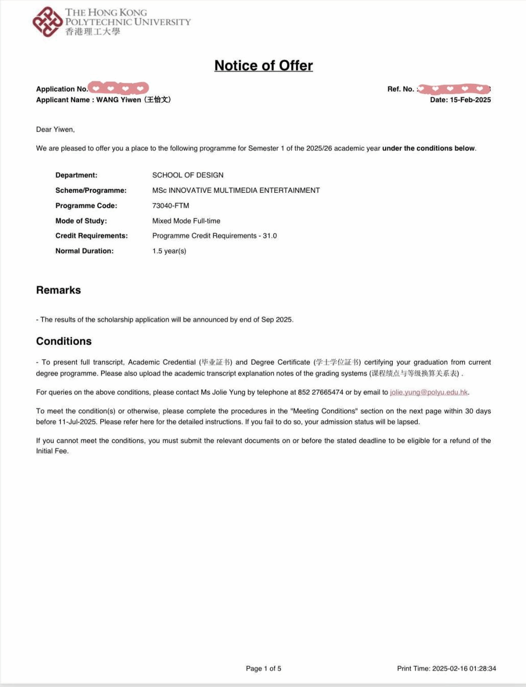 热烈祝贺beat3652021级人工智能艺术学院数字媒体艺术专业学生王*文、敬*,设计艺术学院艺术设计学专业学生余*一通过beat365与香港理工大学“4+1”遴选,成功斩获该校“多媒体创娱”理学硕士录取资格,成为2025年该项目录取学生!