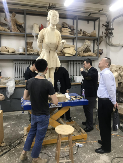 代表团一行参观了以版画实验室为主体的“国家级实验教学示范中心”,听取了造型艺术学院郑金岩院长、版画系主任郭鉴文副教授、雕塑系汤耀胜老师的专业建设情况介绍,并与学生进行互动交流。
