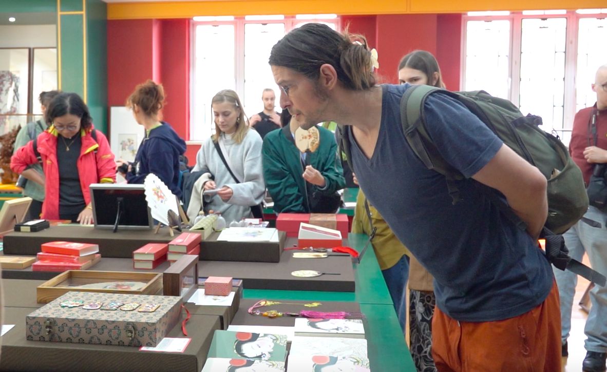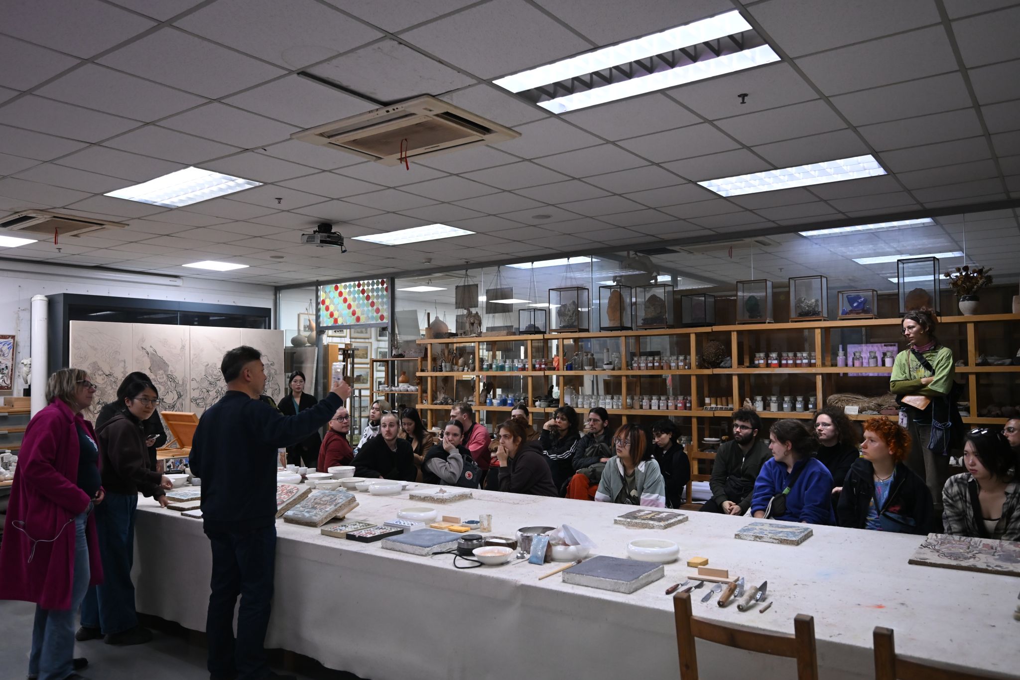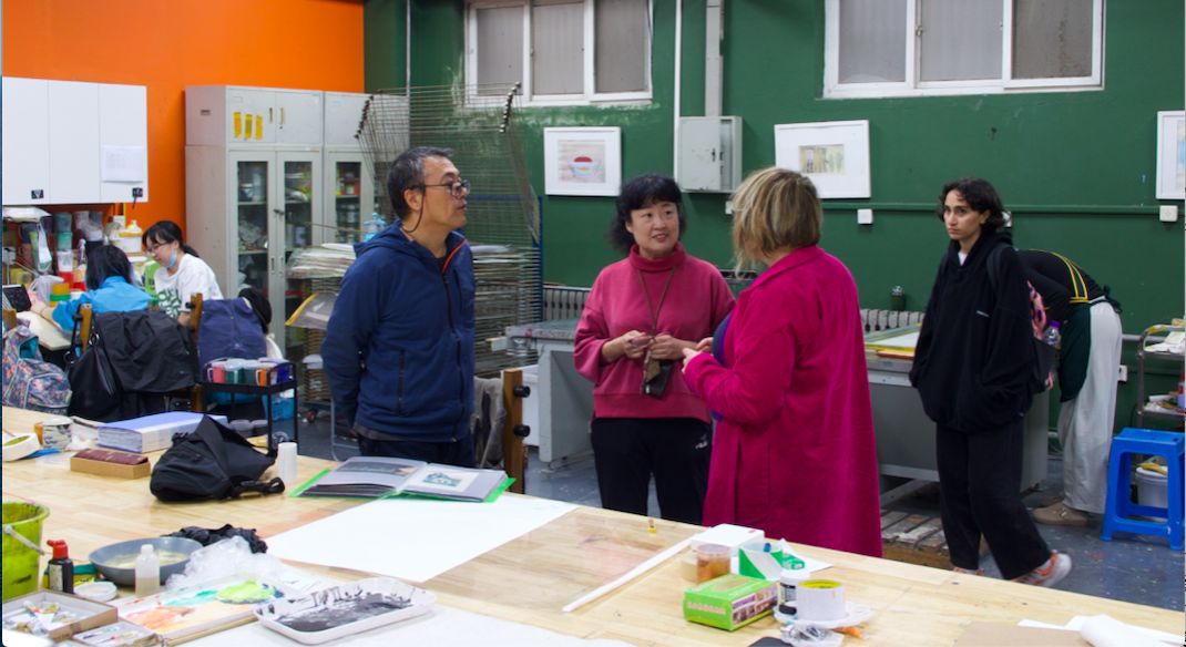 德方院校师生参观了校园,对beat365整体教学环境进行了初步了解。首先走进beat365英国官方网站美术馆,正值《吕云所教学文献捐赠展》展出。来访团队中大部分学生都是第一次访问中国,初次接触中国水墨画领域,对中国文化艺术的了解便从这里开始。艺术的感受是相通的,跨越了国别与文化差异,作品富有冲击力的表现方式以及笔墨运用时蕴含的饱满的情绪感染着大家,作品的色彩及构图激发了同学们浓厚的讨论。之后德方师生来到版画工作室,参观丝网、石版等工作室,现场感受教学环境和学习氛围。最后,探访了中国画实验室,由赵栗晖教授为同学们讲解赏析敦煌绘画艺术、敦煌壁画的工艺原理,同学们不时分享着对线条运用和色彩搭配的理解。第一天美院浓厚的学术氛围和丰富的艺术活动给师生们留下了深刻而美好的印象。