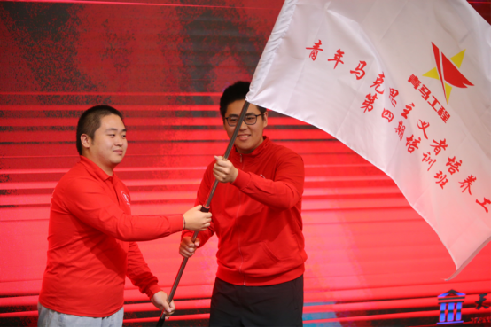 第四期学员代表金尔恒从第三期学员代表赵炳吉手中接过“青马工程”培训班班旗