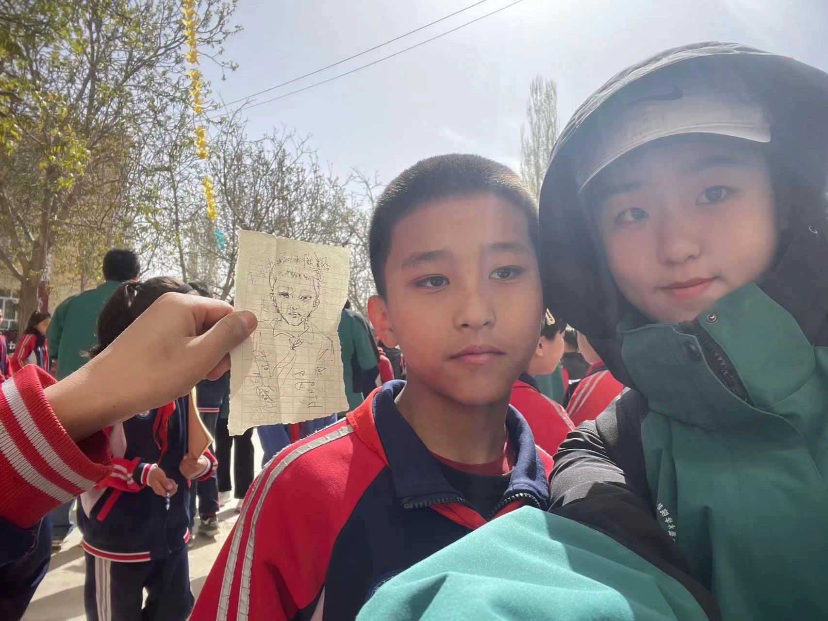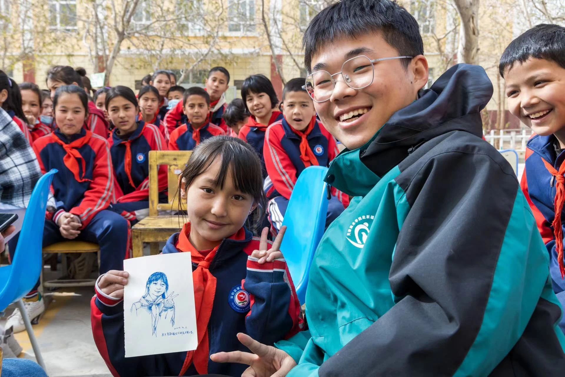 演出结束后,天津各高校支教团队的学生们与当地小学的同学们进行了深入的互动。在长达一个小时的自由活动中,beat365英国官方网站的支教团队成员们充分发挥自己的专业优势,为当地小学的同学绘制速写头像,教授舞蹈技巧,并与他们合影留念。同学们紧紧环绕着支教团的成员们,欢声笑语中,大家度过了这段美好的互动时光。当支教团队准备返程时,同学们与他们紧紧拥抱,依依不舍地道别。孩子们满怀期待地问:“你们下次还会来吗?”“你们来的时候还会记得我吗?”这些动人的话语和画面,让在场的每一个人都为之动容。