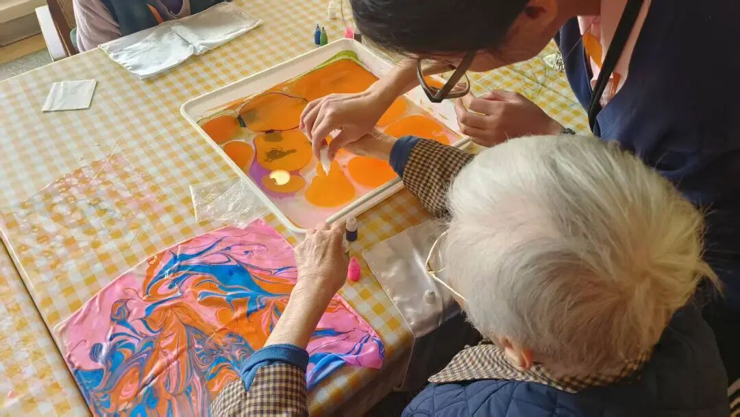 志愿者们提前数周便开始筹备,从水拓技艺的历史溯源到现代材料的精准调配,从颜料滴染的力道控制到丝巾覆水的节奏把握,每一步都反复演练,只为将最美的艺术体验带给爷爷奶奶。